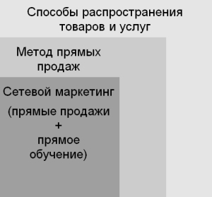 1. Прямые продажи. Контакт между дистрибьютором и покупателем во-первых происходит не в специально для этого созданном помещении (магазин, рынок), а где угодно (дома у покупателя, на улице, на презентации и т.д.), и во-вторых начало контакта исходит не от покупателя (как в обычном способе продажи), а дистрибьютора.
