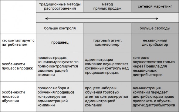 Это определение, с одной стороны отражает принадлежность сетевого маркетинга к экономическим механизмам распространения, а с другой выделяет основные качества, отличающие его от других методов. Эти особенности представлены также в следующей таблице, которая располагает различные методы распространения по шкале от большего контроля к большей свободе.